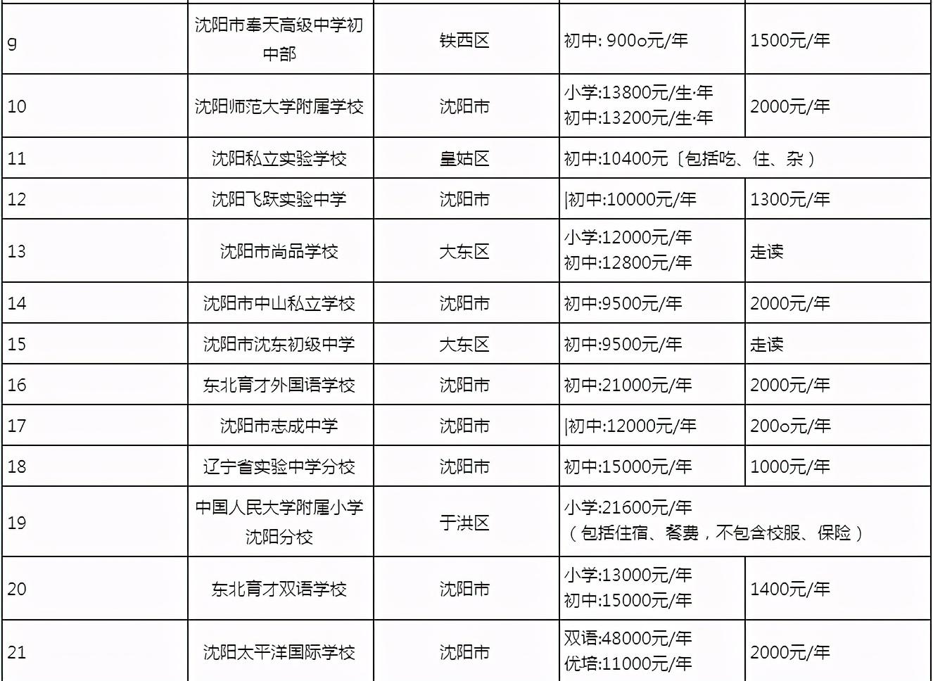 沈阳市尚品学校小学和初中生一年的学费都超过了12000元,沈阳市志成中学、辽宁省实验中学分校和东北育才双语学校的学费标准都是在12000元—15000元之间,住宿费也是不等的。