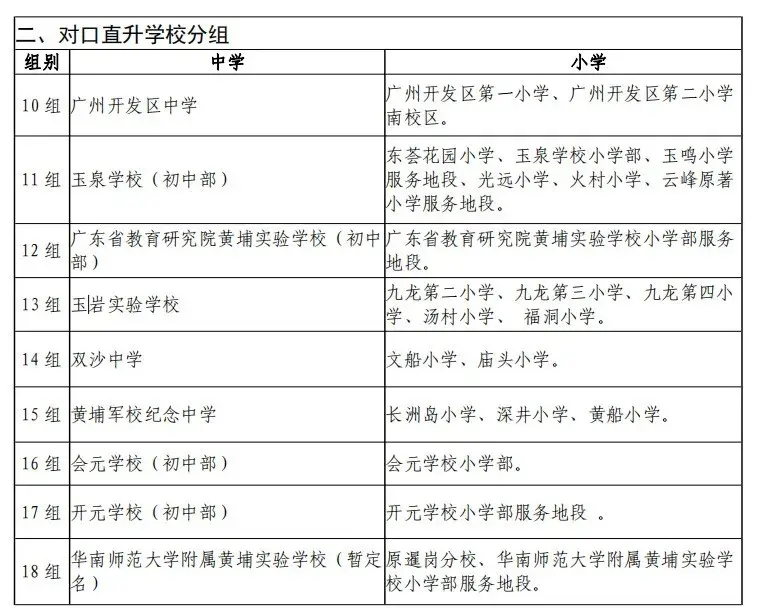 根据2021年的招生政策,黄埔区采取单校划片对口直升和多校划片电脑随机派位两种方式分配学位。其中,对口直升分组表如下:
