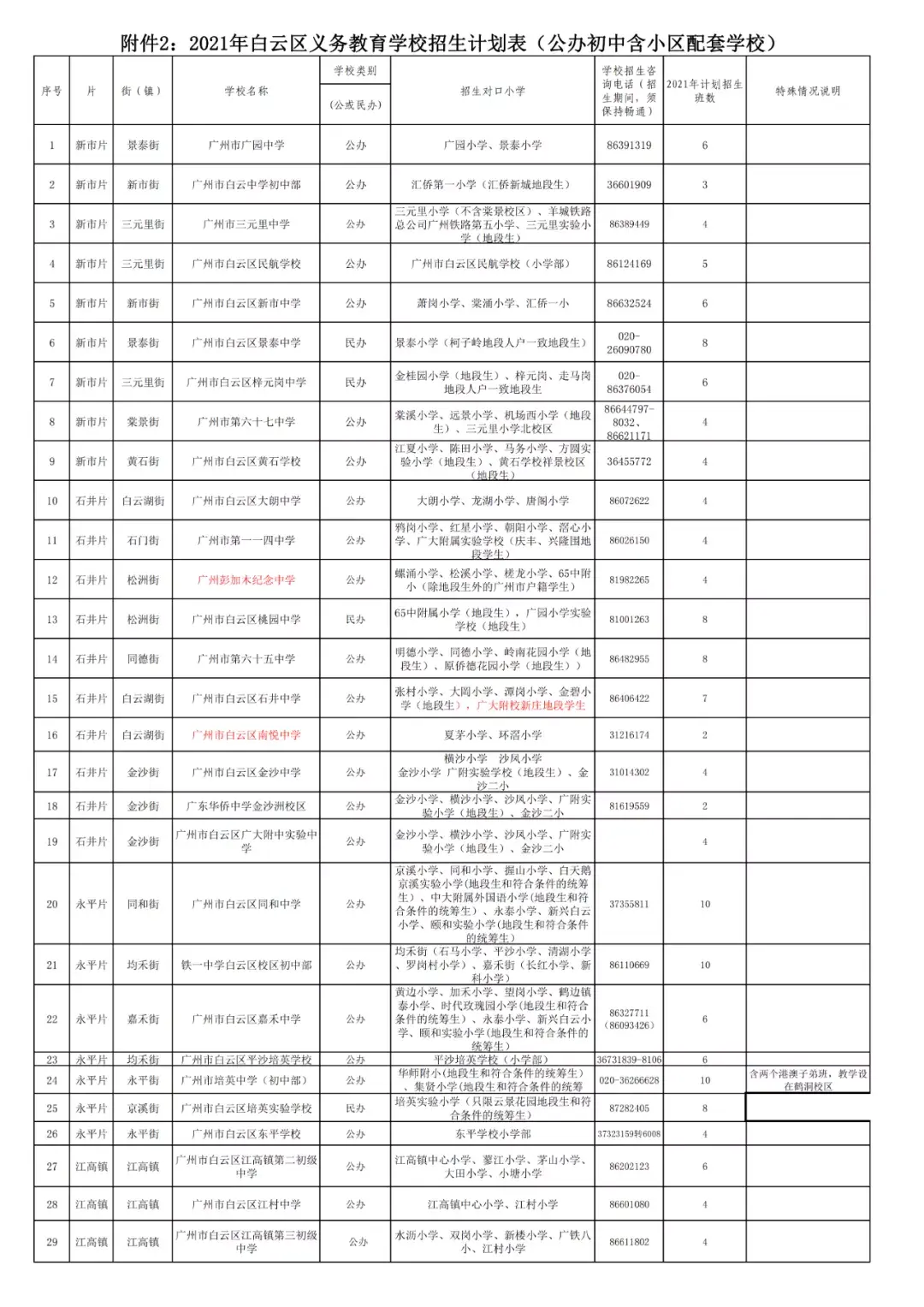 根据2021年的招生政策,白云区以划片对口直升为主要升学方式,2021年各初中对口小学如下: