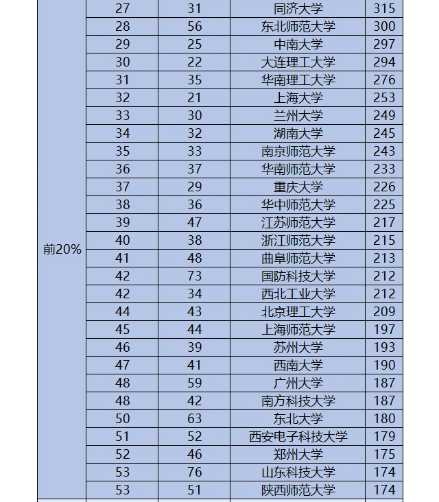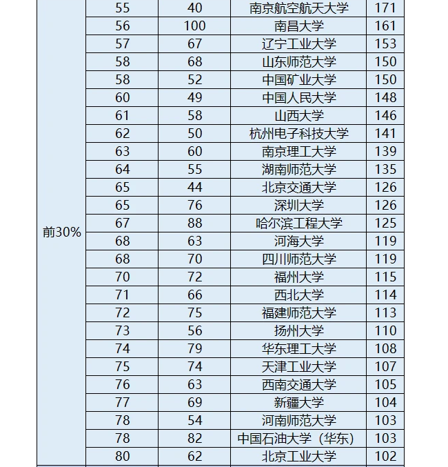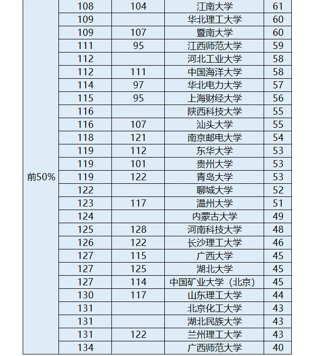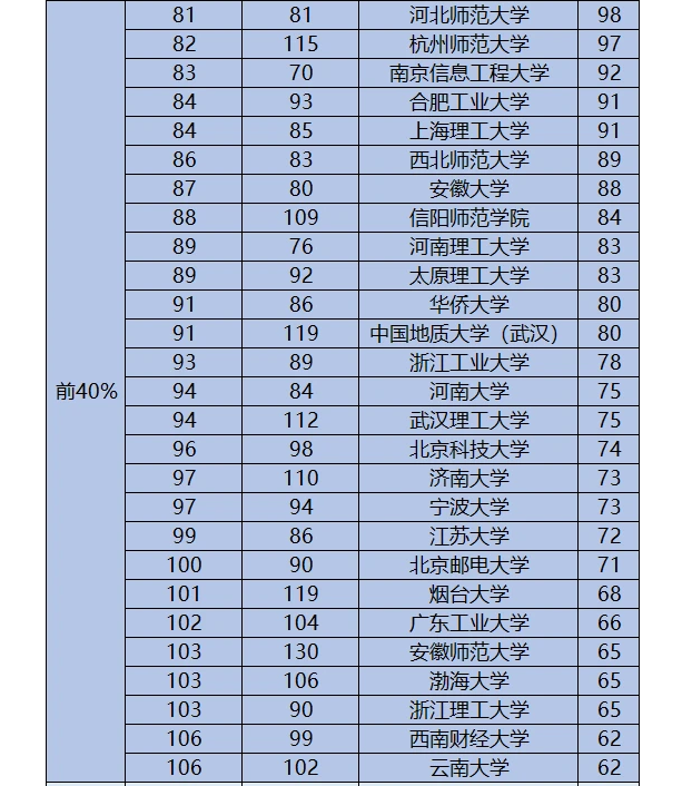 这个层次的大学数量比较多,比如我们熟悉的211工程大学:同济大学、东北师范大学、中南大学、大连理工分别排在第27到第30位,其中东北师范大学进步很大,从去年的第56位进步到了28位。而国防科技大学的进步也很明显,虽然数学不是他们的优势学科,但是从去年的73位进步到了第42位,真是要恭喜被国科大数学专业录取的考生们。