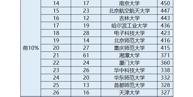 排在第三个层次的一共有13所大学,进入了排名前10%,从数据中可以看出,南京大学排在第14位,比去年进步了3名;而吉林大学的数学学科在东北地区一直处于领先位置,今年比去年排名靠后的一些,排在第16位,湘潭大学的表现可以说是最亮眼的,从去年的第61名,进步了40位,排在了第21名。