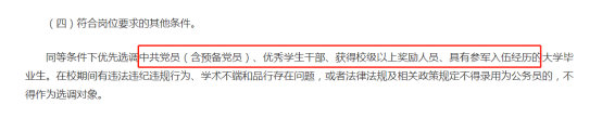 纵观全国来看,中共党员(含预备党员)、优秀学生干部、校级及以上奖励、参军入伍等四项条件在绝大部分各省市定向选调招录条件中均有出现,不过对此作出的要求略有不同。以广东为例,具有上述四项条件的考生在同等条件下优先选调;而以重庆、贵州为例,则是要求满足上述四项条件之一。