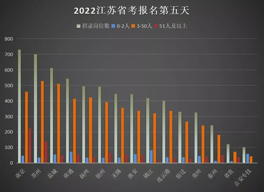 2022江苏省考报名进行到第五天,南京地区以223个岗位标红占据总体标红岗位数的25.51%名列前茅。匹配省考岗位