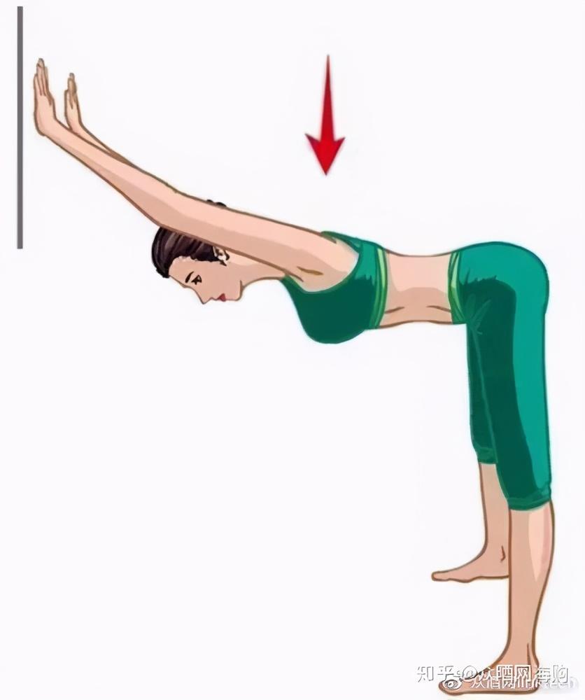 动作要点:寻找一面相对平整的墙壁,双手手掌摁墙,手臂打开,与肩同宽,两腿张开,背部脊椎拉长平行于地面,背部与地面整个呈平行状态,双手摁墙的部位稍稍高于头部,支撑住墙壁,运用背部的力量向下压,这样可以让我们颈部以及背部的肌肉得到充分的拉伸