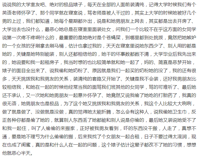 初中时候一个绿茶婊,学习特别好,全级前十,那时候我把她当闺蜜,她的家庭条件挺差的,我每次买的衣服她如果喜欢的话就让她拿去穿了,有一次我和她还有一个姑娘去玩,这个姑娘学习也不错,我们边走边聊就聊到周末几点起床了,我说我就睡到自然醒(我学习最差,在倒数),另外一个姑娘说她睡到中午一两点才起床(事实也是这样,每次我周末去找她玩她都还在床上趴着呢)然后那个绿茶婊不小心说漏嘴了,说她六点起床,那个姑娘问她起那么早干嘛,绿茶婊支支吾吾的说她六点起床玩。谁都知道她六点起床是背书的,就害怕那个学习也好的姑娘超过她。还考试给我传错的答案。