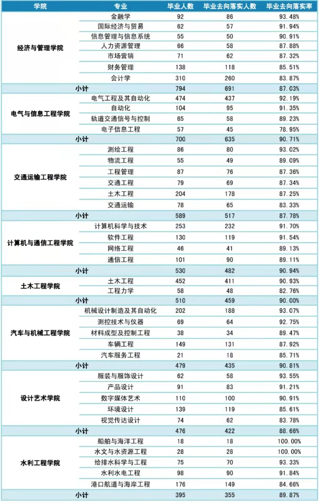 而在5个学院中,会计学、电气工程及其自动化、土木工程、计算机科学与技术4个专业,毕业人数均在200人以上,其中电气工程及其自动化高达474人,土木工程更是在土木工程学院、交通运输工程学院两个学院开设、合计超过600人。尽管会计学落实率相对更低一些,只有83.87%,但是考虑到会计学招生量大、应用面宽,还是值得报考的。