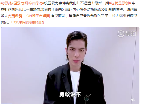 而也许是十分愧疚自己当初做过的事情,萧敬腾如今也参与到了“反对校园暴力倾听者行动”中,还用歌声来鼓励那些被霸凌过的孩子,走出阴影。