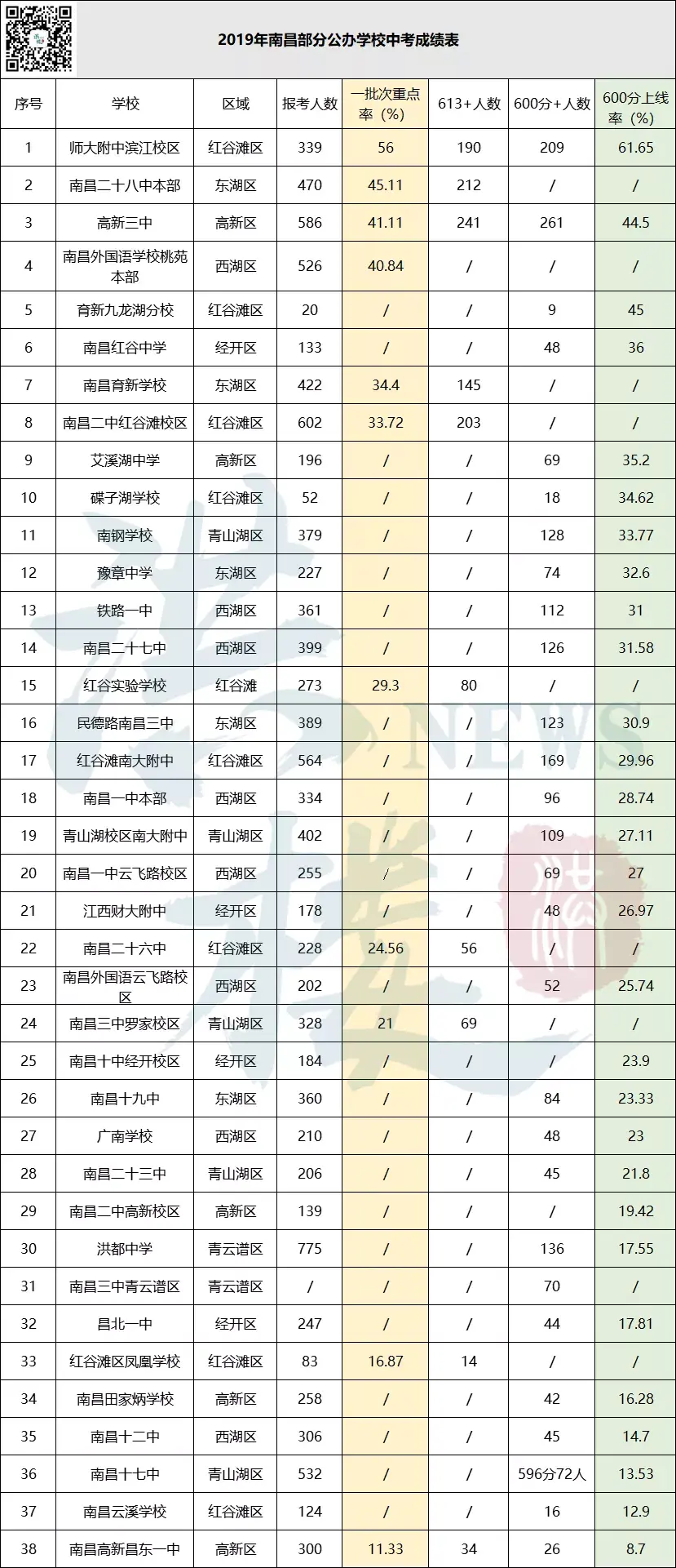 这里面最有话题性的应该就是洪都中学了,主城区最多生源的老牌学校(770+),现在也没落了,以前洪都中学的口碑还可以的,现如今17%的600分率实在是有点拿不出手,未来加油吧!