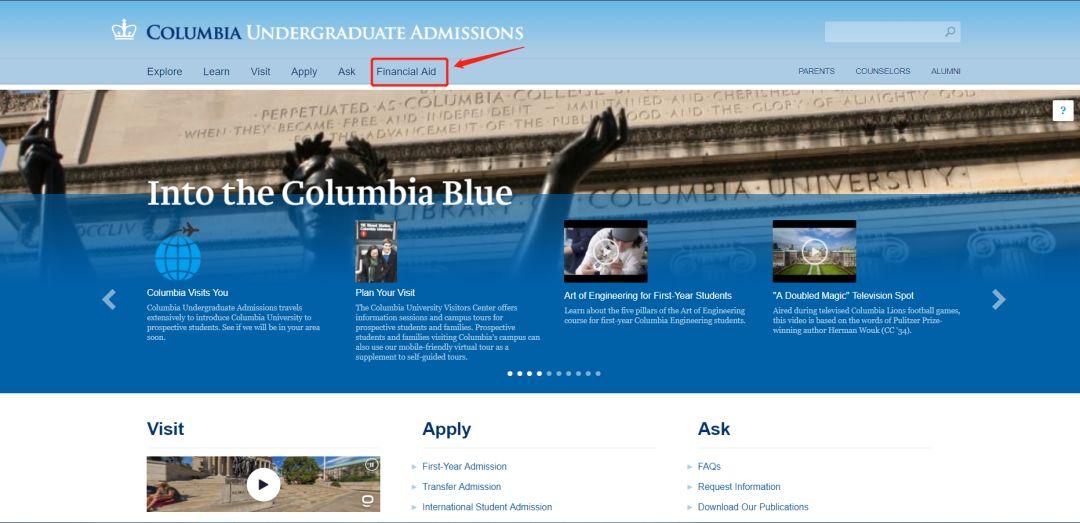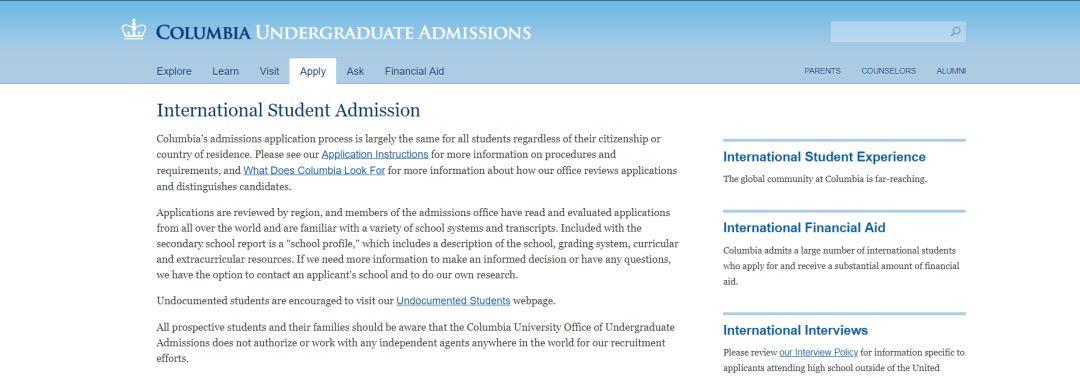 而助学金申请通道字样通常为Financial Aid/Support,哥大官网是显示在第11步,点击Admission后跳转界面的上方公告栏里。