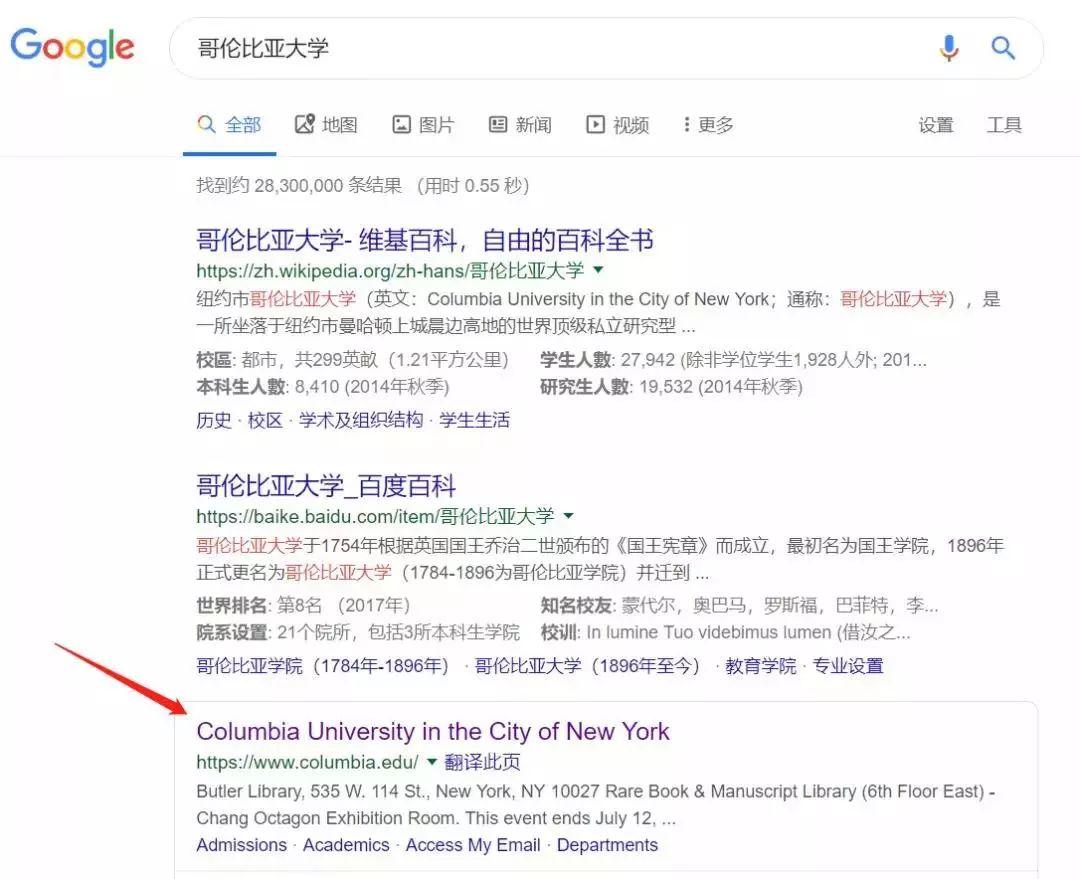 首先通过搜索引擎哥伦比亚大学,一般情况下,学校官网的网址大多为https://www.学校英文名称.edu/