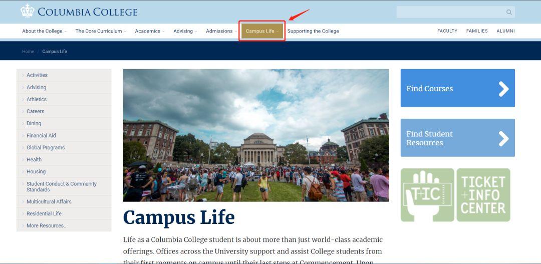 在这个页面中,我们还可以看到很多同学都很关注的学校文化信息,即页面上方点击Campus Life(有的学校会将这一栏放在在Admission子菜单下),这里会介绍学校的一些基础硬件设施,包括宿舍环境、校园活动、饮食等。