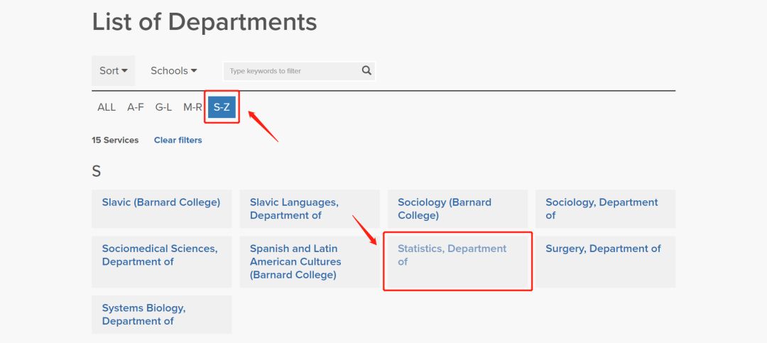 在这一页面,多数学校按照A-Z的字母顺序进行专业院系排序,既然我们今天我们是以统计学为例,那就选择首字母S(Statistic)。