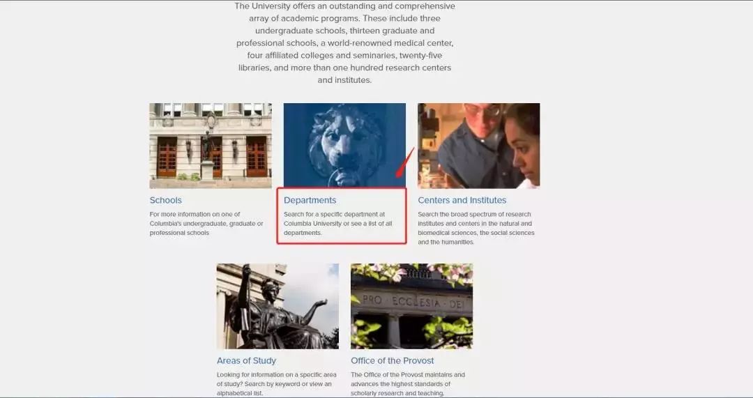 点击进入下一级页面之后,我们可以按照Schools学院/Department专业院系/Areas of study研究领域等等进行查找,一般情况下来说,我们会选择Departments进行查找。