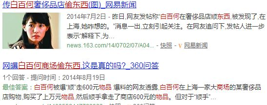 偷奢侈品是一个匿名网友传出的,该网友言之凿凿称白百何在上海某商场顺走了一个奢侈品,可经求证发现并无此事,商场并无失窃报案,白百何当时也没去过上海。