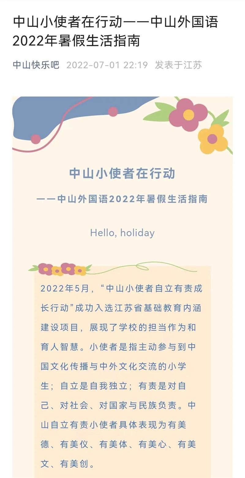 2022年5月,中山外国语实验学校申报的“中山小使者自立有责成长行动”项目经过自主申报、市级遴选、省级评审,最终成功入选2022年江苏省基础教育内涵建设项目。