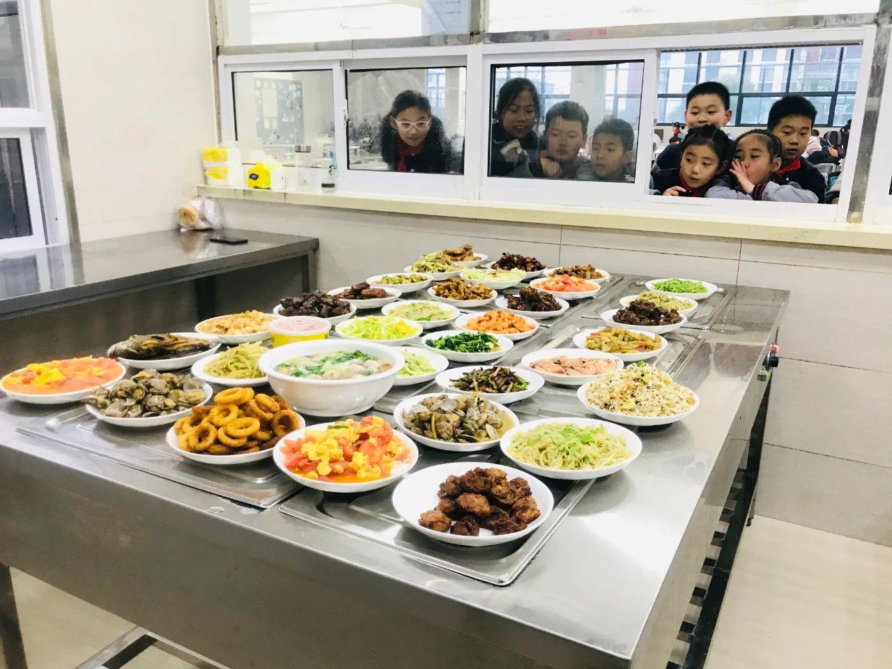 食堂面积1090.43平方米,环境整洁,餐桌餐具干净卫生,有关光盘行动、厉行节约的宣传海报,图文并茂,倡导师生文明用餐。