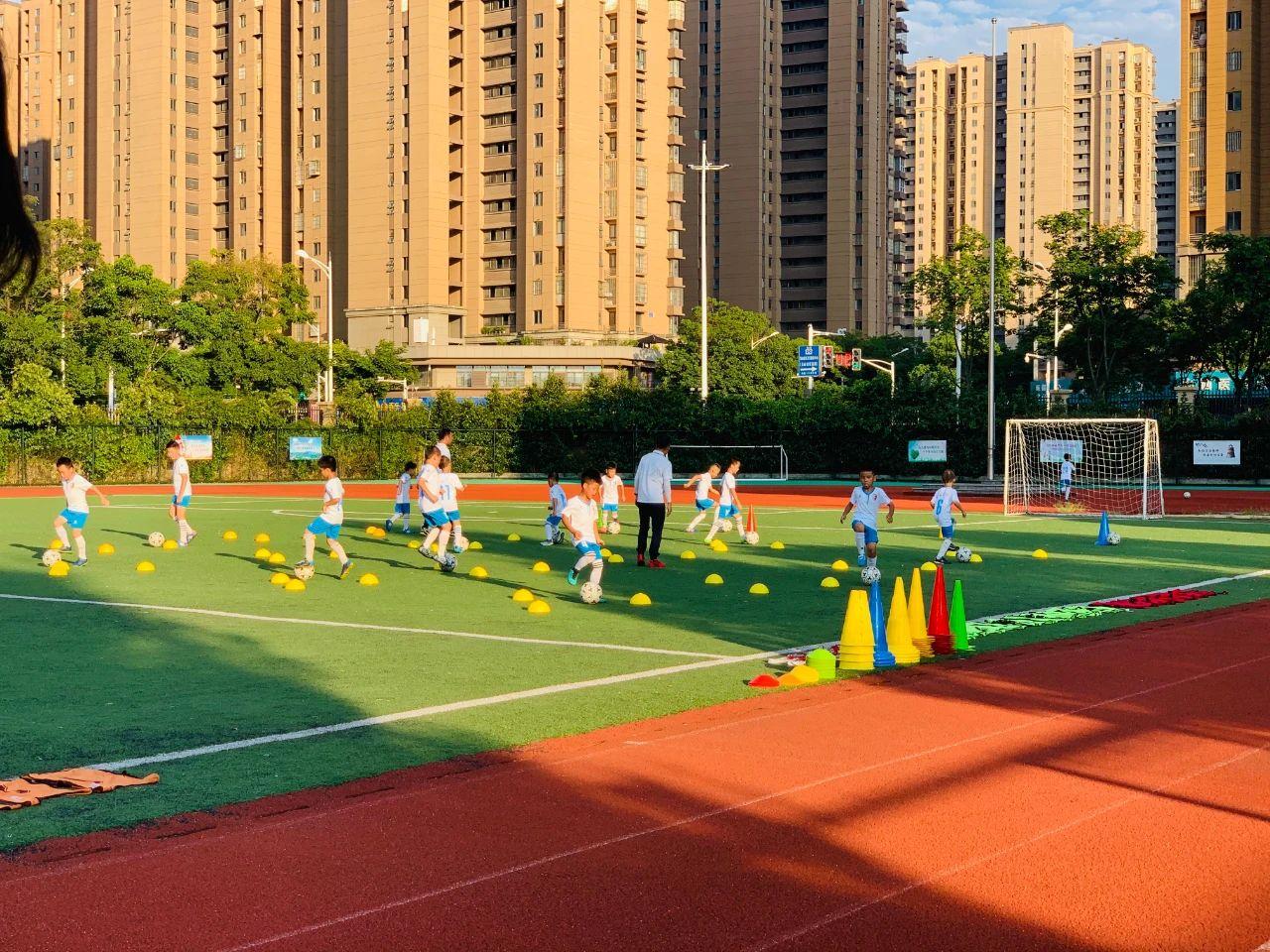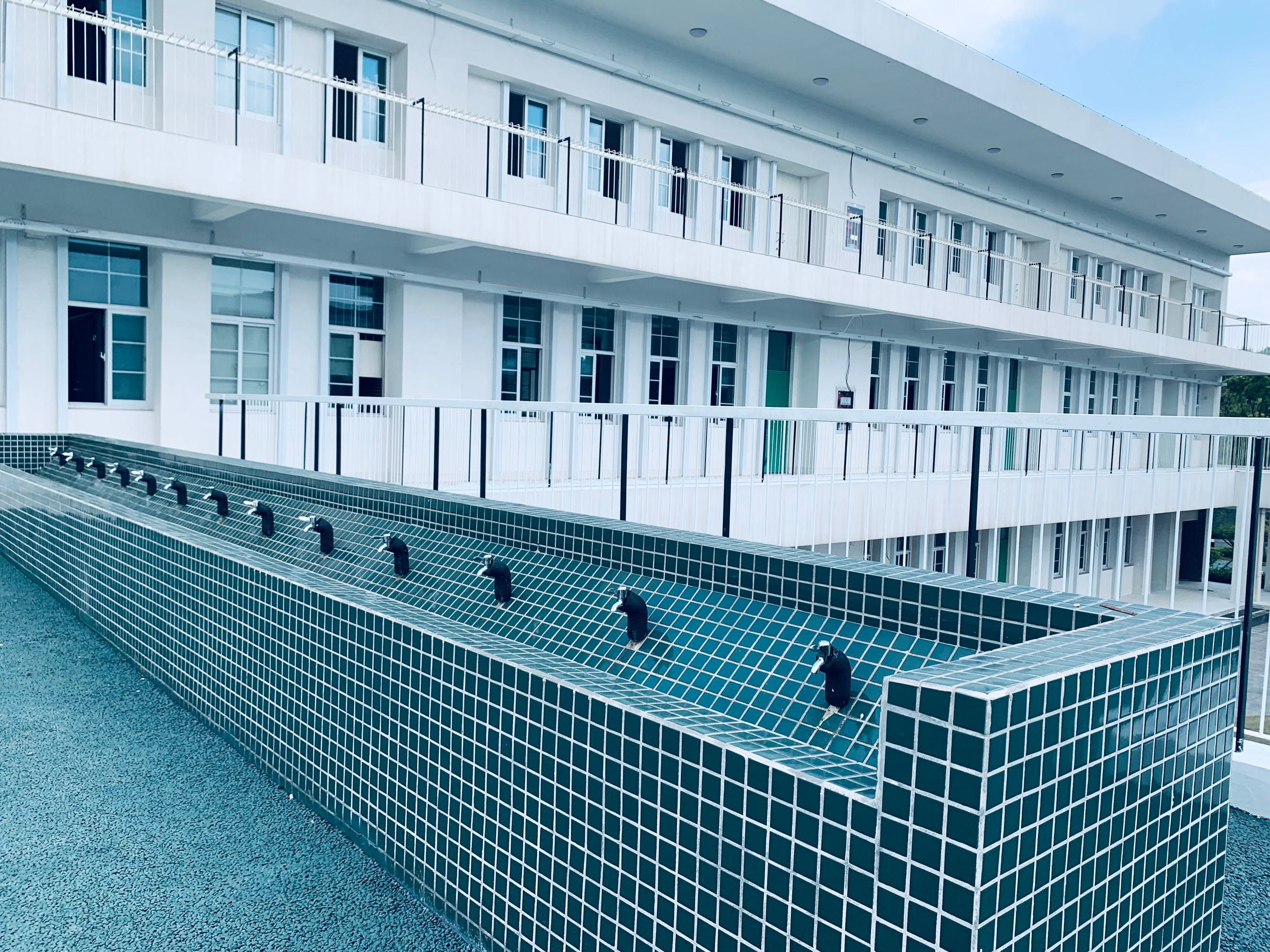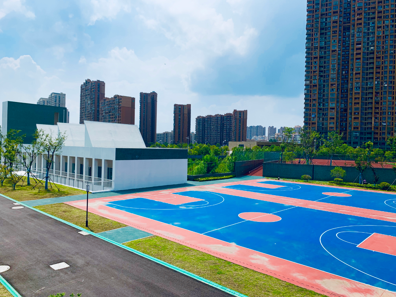 红绿色彩相间的宽阔操场,内含多项常规体育运动区,硬件设施完备,给师生们提供了广阔的运动空间。