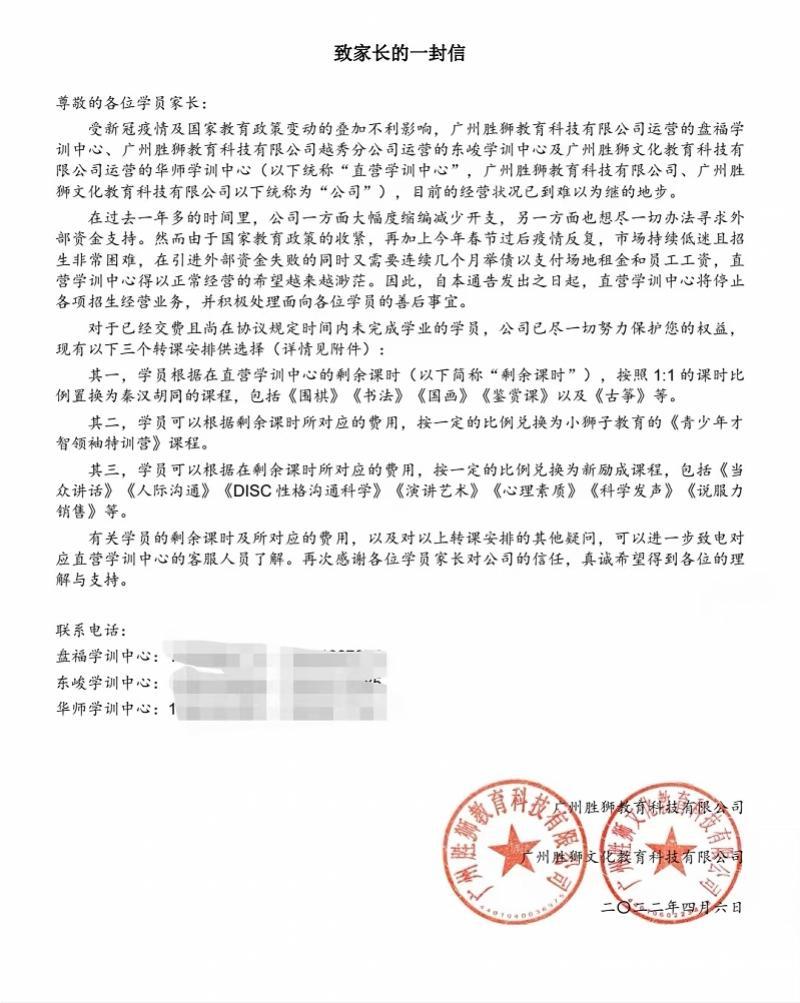 王女士称,2021年9月,因一次性预付有优惠,她直接支付了两年的课时学费共2万余元。但到了今年3月,因疫情防控,胜狮少儿口才培训机构通知暂停线下教学一周。紧接着在4月6日,负责人就在家长微信群发了《致学员家长的一封信》,称正在运营的盘福、东峻以及华师学训中心受疫情影响,已难以为继。自通告发出起停止招生,并将有剩余课时的学员分流至其他合作机构,落款公司为广州胜狮教育科技有限公司、广州胜狮文化教育科技有限公司。