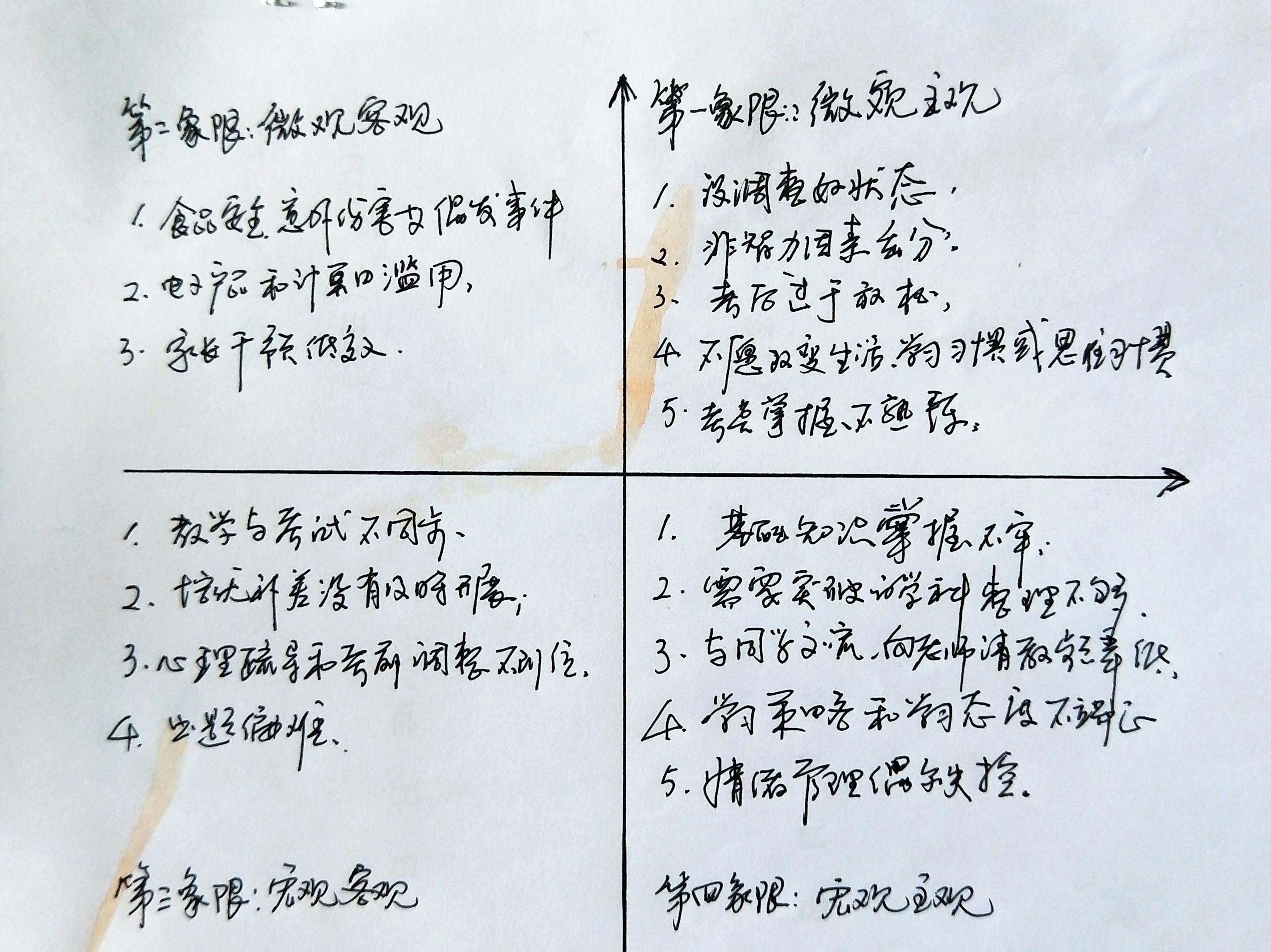 第一象限:微观主观因素,包括没调整好状态;非智力因素丢分;考后过于放松;不愿改变生活、学习习惯或思维习惯;对考点掌握的熟练程度没有达到要求等5个方面;