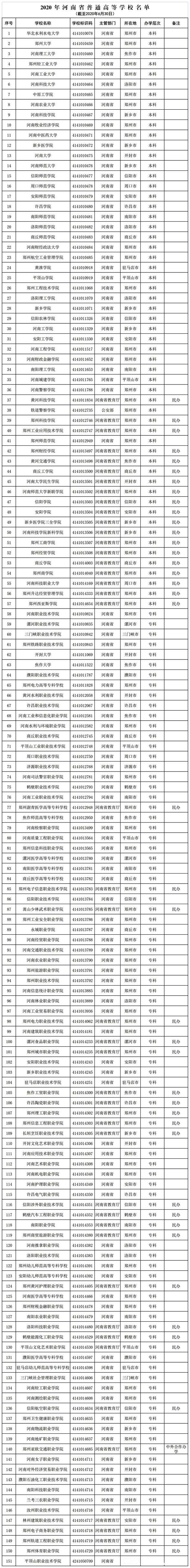 下图是截止到2020年河南省高校名单。