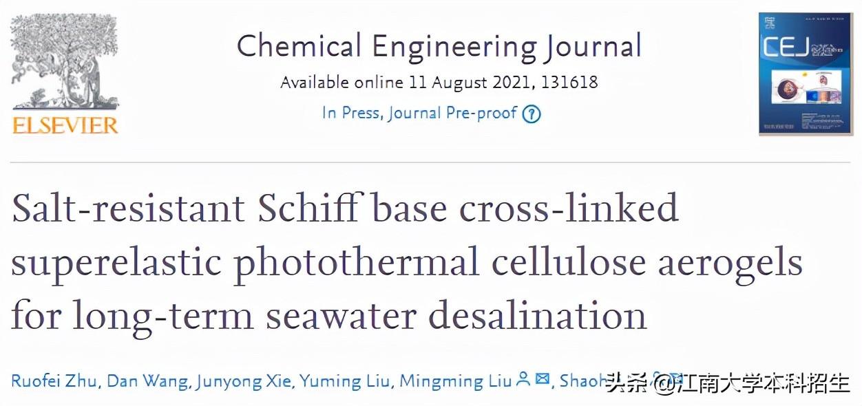 8月,江南大学付少海教授课题组在Chemical Engineering Journal(影响因子13.273)上发表了题为“Salt-resistant Schiff base cross-linked superelastic photothermal cellulose aerogels for long-term seawater desalination”的研究论文。