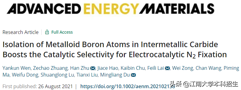 9月,江南大学朱罕、杜明亮科研团队在功能纤维催化材料及其电催化固氮应用领域取得系列进展,连续在国际期刊Adv. Energy. Mater. 、Appl. Catal. B-Environ.上发表研究论文:“Isolation of metalloid boron atoms in intermetallic carbide boosts the catalytic selectivity for electrocatalytic N2fixation,Adv. Energy Mater. 2021, 2102138 (通讯作者朱罕副研究员、赖飞立博士和杜明亮教授)”和“Metal-free boron and sulphur co-doped carbon nanofibers with optimized p-band centers for highly efficient nitrogen electroreduction to ammonia, Applied Catalysis B: Environmental, 2021, 292, 120144. (通讯作者朱罕副研究员和杜明亮教授)”,论文第一作者均为2019级博士研究生文炎坤。
