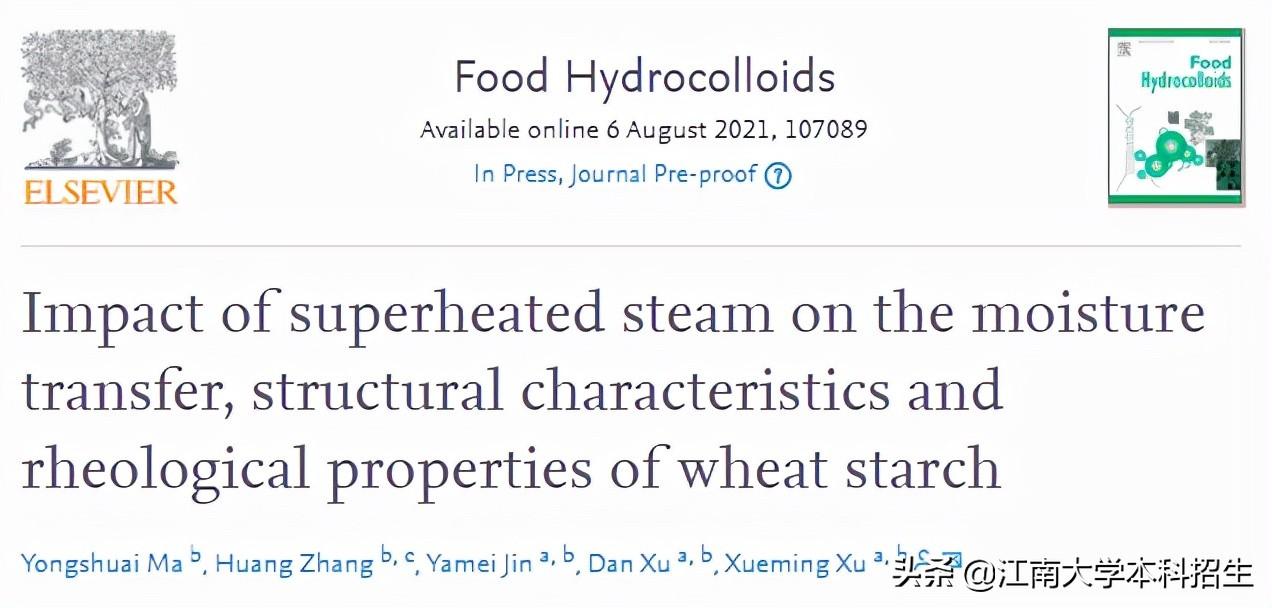 8月,江南大学食品学院徐学明教授团队在国际期刊Food Hydrocolloids在线发表了题为“Impact of superheated steam on the moisture transfer, structural characteristics and rheological properties of wheat starch”的研究论文。徐学明教授为通讯作者,Yongshuai Ma为第一作者。