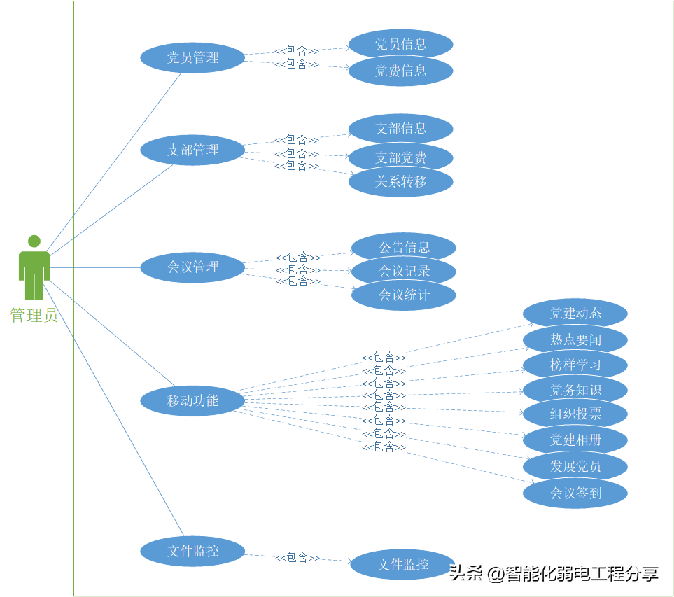 参与者(Actor)——与应用程序或系统进行交互的用户、组织或外部系统。用一个小人表示