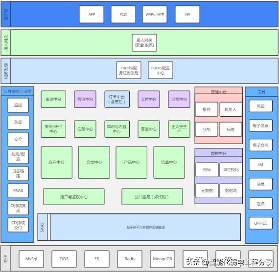 使用一套方法论/辑对产品(项目)所涉及到的业务进行边界划分,所以熟悉业务是关键,如下图所示某业务中台架构图:
