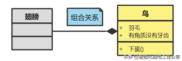 组合关系(用带实心菱形的实线表示)组合关系同样是关联关系的一种,是比聚合关系还要强的关系。特点:在组合中,部分与整体生命期一致,部分与组合同时创建并同时消亡 。比如:鸟与翅膀的关系。