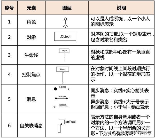 通常被开发者用来对一个场景下的对象交互建模. 它解释了一个系统中的不同部件之间,彼此是通过怎样的交互来实现的某个功能, 以及特定场景下交互发生的顺序.简而言之,时序图展示了系统的不同部件的执行序列.我们在画时序图时常用的6种元素: