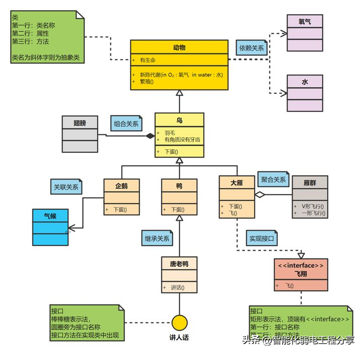 继承、泛化关系(用带空心三角形的实线表示)继承(泛化)关系,它指定了子类如何特化父类的所有特征和行为。例如:鸟是动物的一种,企鹅、鸭、大雁是鸟的一种。