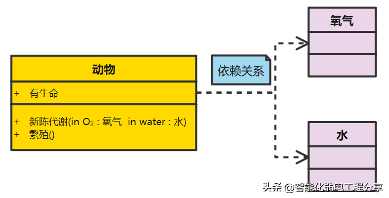 所谓依赖关系,就是构造这个类的时候,需要依赖其他的类,比如:动物依赖水和氧气
