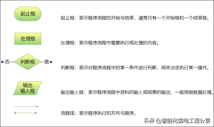 起止框:表示程序流程的开始与结束,通常只有一个开始框和一个结束框。