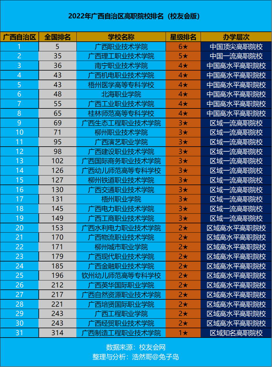 根据中国校友会网(艾瑞深中国校友会网 )最新发布的2022中国大学排行榜,2022年度的大学排名中广西自治区共有31所高职院校进入排名!