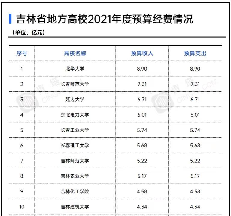 在这份吉林省地方高校经费预算统计中,吉林省共计21所高校进入榜单,既包括原211工程大学的延边大学,也包括吉林省数重点大学的北华大学等,其中居榜单前3名的高校依次为北华大学、长春师范大学、延边大学,是吉林省2021年经费预算最多的地方大学,经费预算分别为8.9亿、7.31亿、6.71亿。