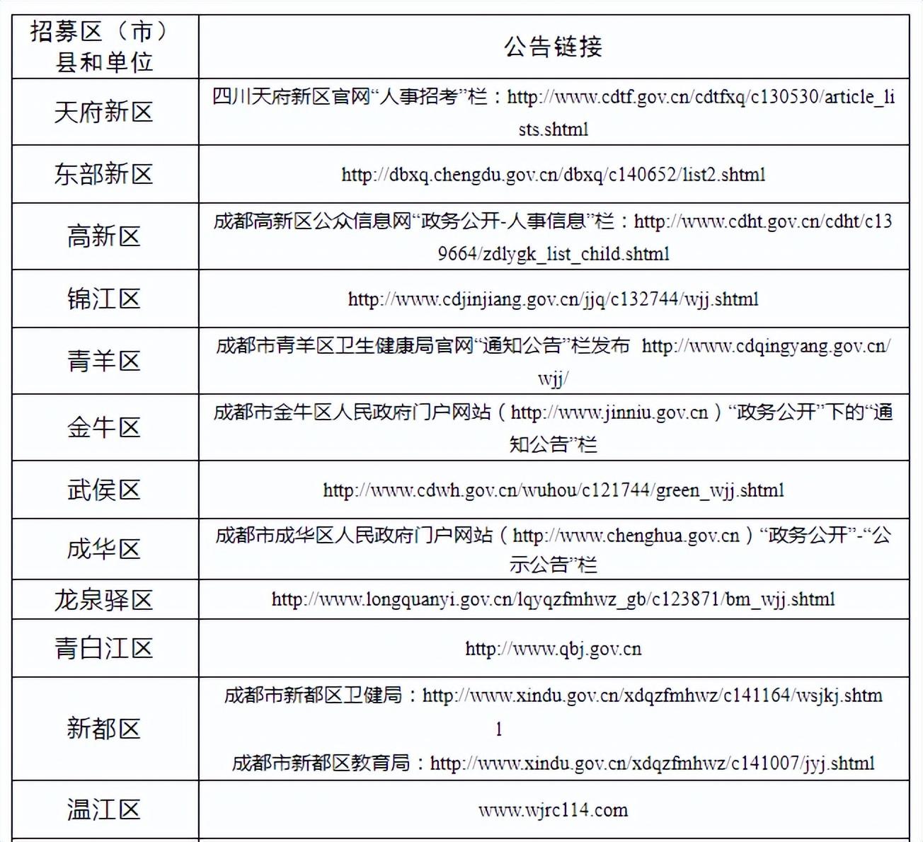 考生可登录各区(市)县卫健部门及相关市级单位等官网查看招募单位公告及岗位条件表等信息,登录成都市人事考试网:cdpta.cdhrss.chengdu.gov.cn进行网上报名。