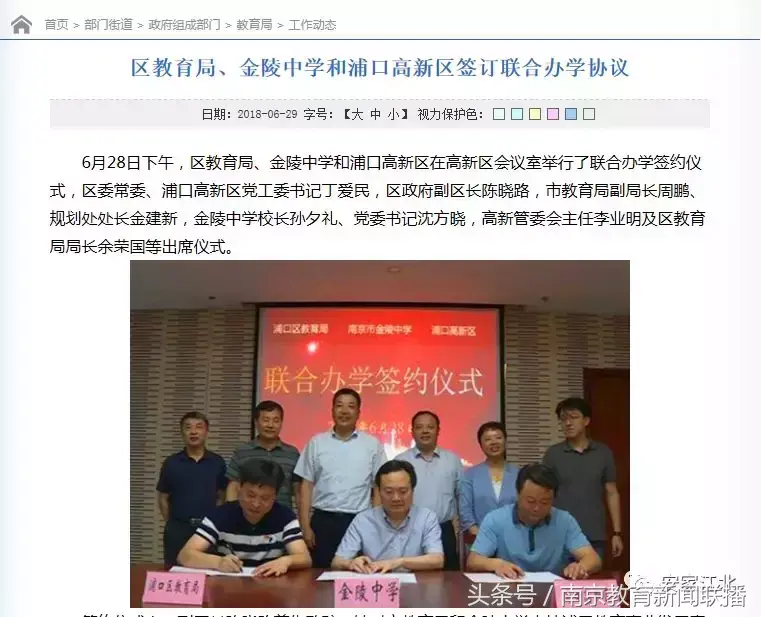 今年6月29日,浦口区政府官网发布了一则新闻:标题为“区教育局、金陵中学和浦口高新区签订联合办学协议”,原文及截图如下: