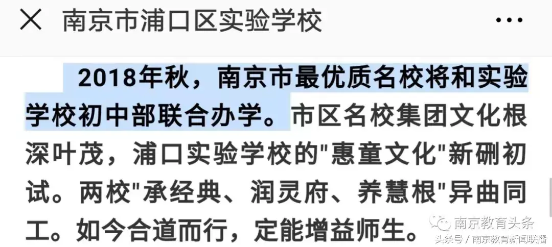 学校官方微信曾发布:2018年秋,南京市最优质名校将和实验学校初中部联合办学,如下图——
