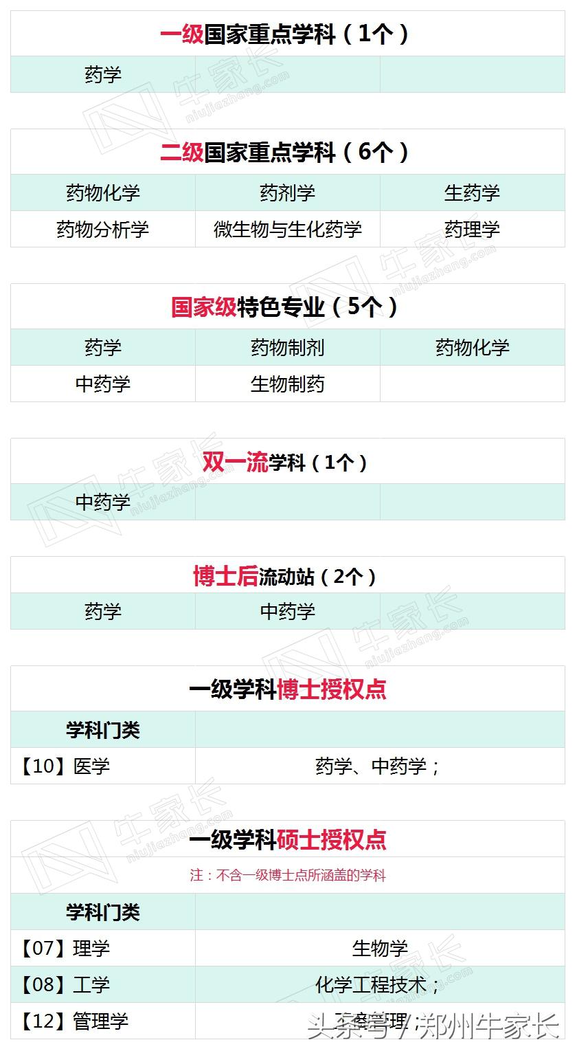 学校师资力量雄厚,荟萃着众多知名的药学专家,在医药学界有着广泛的影响。学校省级以上品牌、特色本科专业及建设点占本科专业数的58%。在教育部学位与研究生教育发展中心组织的全国学科评估中,药学、中药学学科水平始终名列前茅。药理与毒理学、化学、临床医学3个学科领域的ESI排名进入全球前1%。