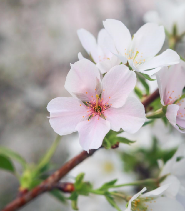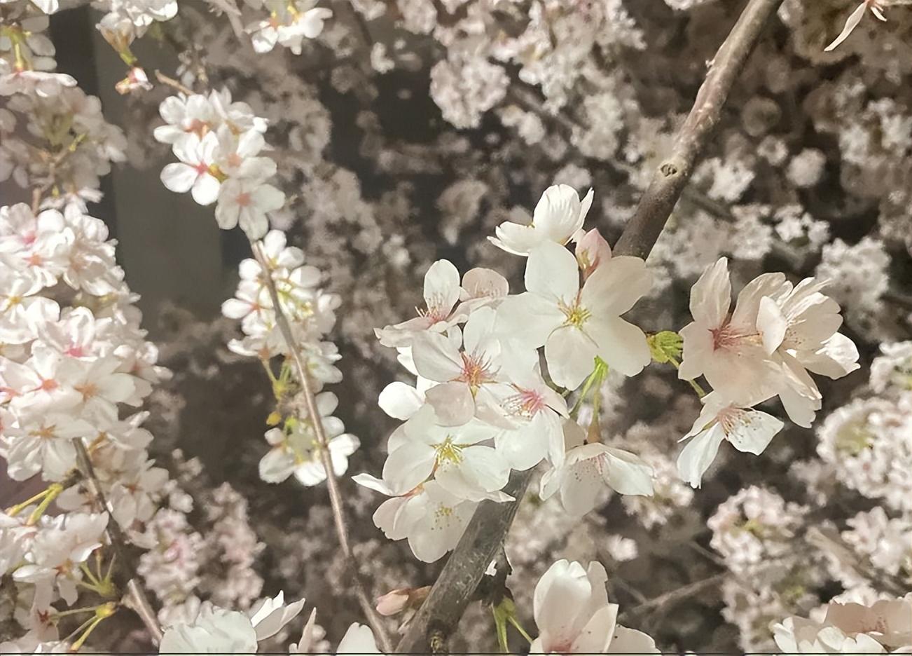 “幸得三月樱花舞,从此阡陌多暖春”。早春的三月里樱花盛开,微风拂过一朵一朵随风而舞,樱花素绽,似一望无际的乌夜中突然闪烁的烟火,在枝头挨挨挤挤,摆出翩翩姿态。
