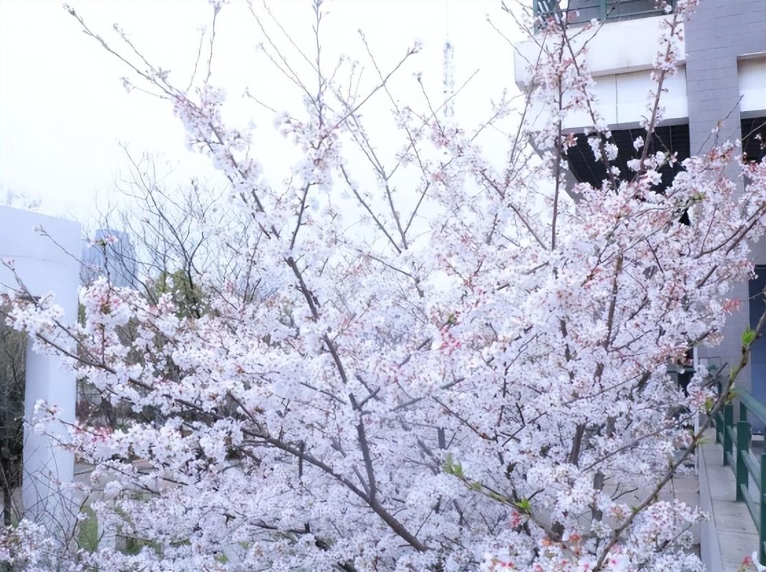 绿漆栏杆,葱郁树木,和风过境,春色浮动,温温柔柔的暖阳洒落,定格着时光的印记。一阵催花雨,唤醒春天的梦,樱花落满头,春天便上心头。靓丽的面孔上是发自内心的笑容,同学们拿着相机记录下这美景,记录下和樱花一般灿烂而盛大的青春。