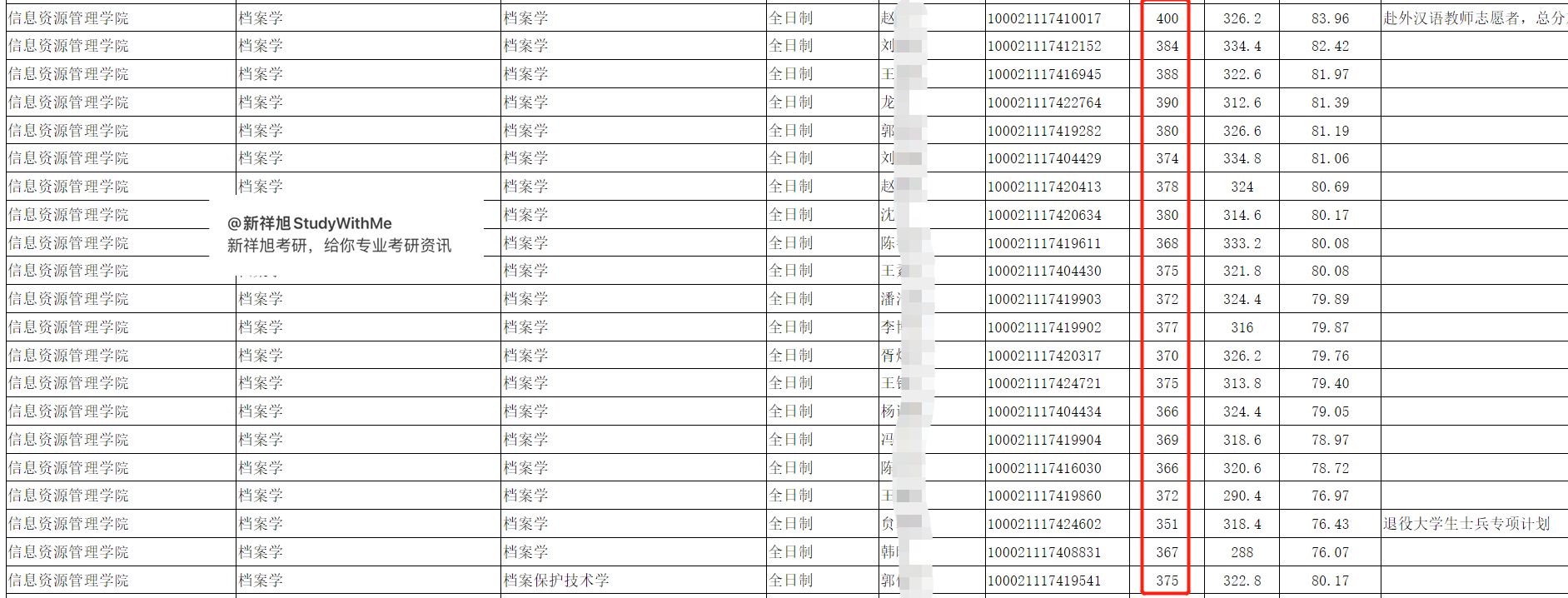 21年人大档案学统考的录取人数还是比较多的,最后录取了21人。通过它的初试分数可以看到最终录取结果,基本上在365~390之间(其中赴外汉语教师志愿者总分加了10分,退役士兵专项计划不占用统考名额)。