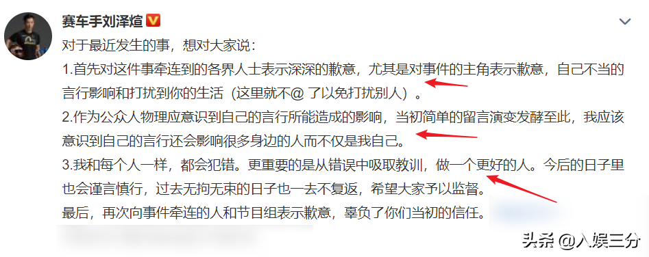但是从刘泽煊道歉发文的内容来看,刘泽煊并没有意思到自己的错误,也并未与向天歌进行和解,从言语中可以感受到他的不满,也许是处出于舆论影响,他才放下了自己的姿态,对因为这件事而备受影响的向天歌表示道歉。