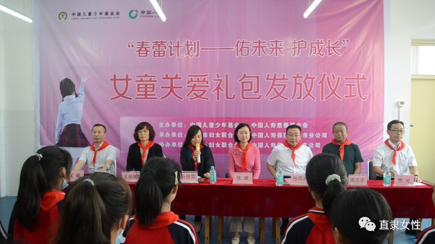 在活动现场,中国人寿保定市分公司副总经理张雨波为羊平小学校长石敏授牌,市妇联与中国人寿保定市分公司为女童们发放了关爱礼包,张雨波和石敏分别讲话。