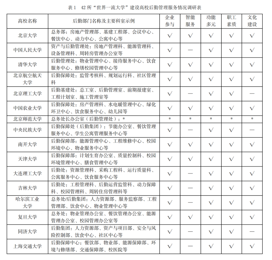 此外,文章调查分析以高校后勤官网信息为依据(调查时间为2021年5月22日),统计出42所“世界一流大学”建设高校后勤管理服务情况调研表格。(如表1)