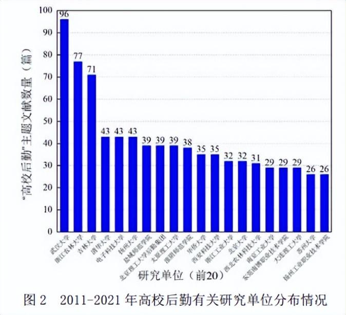从高校后勤有关研究单位角度,分析2011-2021年间研究文献发表单位的分布情况,(如图2),需要说明的是,图中仅列举了数量排序前20所研究单位。可见:近十年间高校后勤研究领域中武汉大学的研究内容最为丰富,其次为浙江农林大学、吉林大学,其余单位平均每年发表相关文献数量也在2篇以上;在统计的20所研究单位中,涉及湖北省、浙江省、吉林省、北京市、四川省、江苏省、山西省、福建省、陕西省、广东省、辽宁省共11个省或直辖市,研究覆盖范围较广,且“双一流”建设高校所占比例为40%。