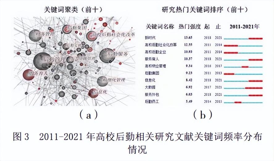 通过对所检索研究文献的关键词进行聚类分析与排序,可获得2011-2021年高校后勤相关研究文献关键词频率分布情况,(如图3a),此处仅显示排序前十的内容,且聚类团簇越大代表含此研究关键词的文献越多。由结果可知,近年来高校后勤研究领域的研究工作主要集中在以下方面:后勤管理、后勤服务、财务管理、高校后勤社会化改革、服务育人、后勤集团、信息化、精细化管理、人力资源管理和后勤文化,且各关键词间具有较强的关联性(即聚类团簇间的连线)。