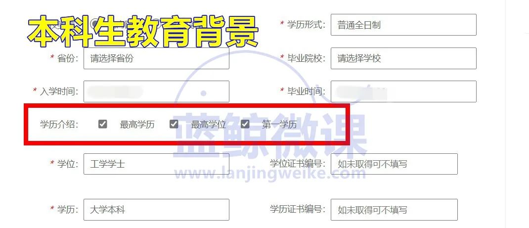 “最高学历”、“最高学位”、“第一学历”三个全选。(专科相同)
