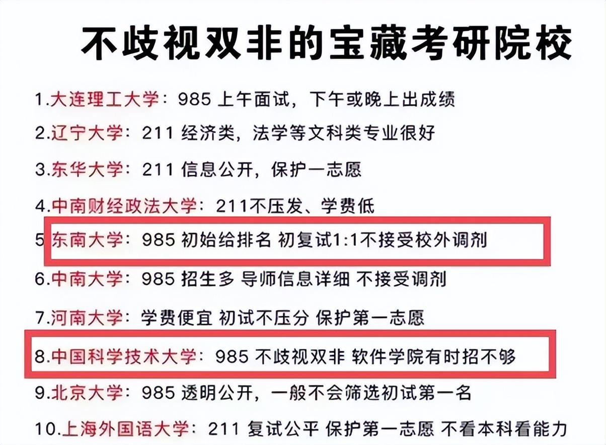 东南大学也是不歧视双非院校,且不接受调剂,保护第一志愿。还有中国科学技术大学明确不歧视双非院校,这样的院校有的时候还招不满学生。北京大学复试公开透明,同样的不歧视双非元院校的学生。